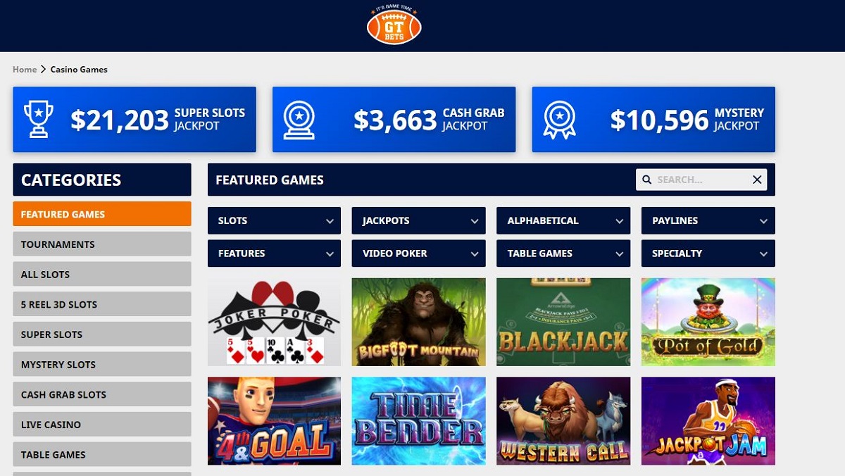 For being a sportsbook first and foremost, GTbets has a great selection of slot titles at the casino side of their site! Players can choose from five-reel 3D slots and a wide selection of jackpot slots that can range from prizes as low as $2,000 all the way up to $55,000!